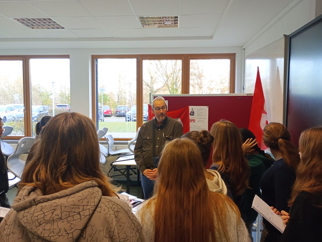 Vergangenen Freitag haben die Fraktionen und Gruppen des Eppinger Gemeinderats ihren Beitrag zu diesem historischen Ziel geleistet: Sie haben sich der 9. Klassenstufe des Hartmanni-Gymnasiums Eppingen vorgestellt und standen bereit ihre Arbeit löchern zu lassen. Für unsere SPD-Fraktion stellte sich Dr. Jürgen Hetzler den Fragen der neugierigen Schüler:innen. Von Diskussion über den Beschluss zum McDonalds, bis hin zur Frage der Strafbarkeit einer Abtreibung, waren die jungen Gymnasiast:innen sowohl direkt an der kommunalen Arbeit der Stadträte, wie auch ihrer generellen (partei-)politischen Haltung interessiert. So konnten aber nicht nur die Schüler:innen etwas über die Kommunalpolitik und ihre Partizipationsmöglichkeiten erfahren, auch die Gemeinderäte schätzten die Möglichkeit zum direkten Austausch ungemein. Aber nicht nur politisch, sondern auch etwas persönlicher: Jürgen Hetzler wird hoffentlich dem Tipp einiger junger Swifties folgen und einmal in das neue Taylor Swift Album reinhören ;D